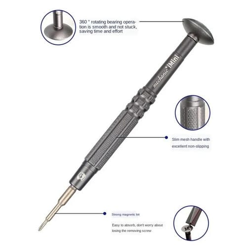 El set de herramientas Mechanic iMini Series Phillips 1.5 está diseñado para la reparación precisa de Teléfonos Móviles, gafas y Relojes. Este kit incluye un destornillador con cabezal Phillips 1.5 fabricado en aleación de acero forjado de alta dureza (HRC56-59), que garantiza durabilidad y resistencia al desgaste durante su uso. Su diseño incorpora un mango antideslizante de malla delgada y un sistema de rotación de rodamientos de 360 grados para un manejo suave y eficiente. Además, el cabezal magnético facilita la manipulación de tornillos pequeños, evitando pérdidas y facilitando el ensamblaje. Su tamaño compacto, con un cabezal de aproximadamente 36 mm y una varilla de 97 mm, lo hace ideal para trabajos de precisión en dispositivos electrónicos y objetos delicados.