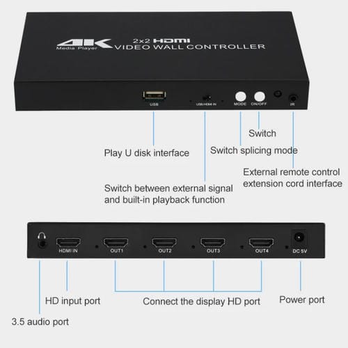 El controlador de pared de video XP03 4K es un procesador avanzado para empalme de Pantallas múltiples con configuración 2x2 y Soporte para Señales HDMI de alta definición. Diseñado para usuarios que requieren dividir una Señal HDMI Completa en cuatro bloques independientes, este dispositivo permite conectar hasta cuatro unidades de visualización, como televisores LCD o unidades de retroproyección, para formar una gran Pantalla dinámica y uniforme. Además, integra función de reproducción directa desde unidad flash USB, facilitando la visualización de vídeos, imágenes, música y documentos PPT sin necesidad de dispositivos Adicionales. Compatible con resoluciones hasta 4K (3840 x 2160) y múltiples modos de empalme, este controlador es idóneo para instalaciones profesionales que demandan Flexibilidad y alta calidad de imagen.