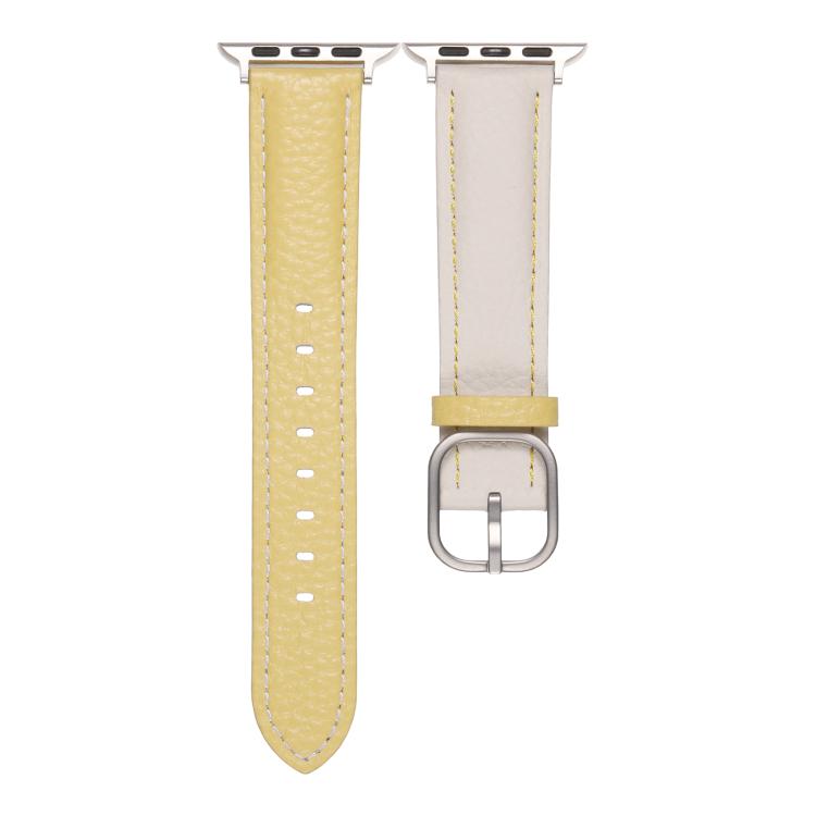 Correa de cuero genuino con textura de lichi y hebilla cuadrada para Apple Watch de 42 mm, 41 mm, 40 mm y 38 mm (blanco y amarillo)