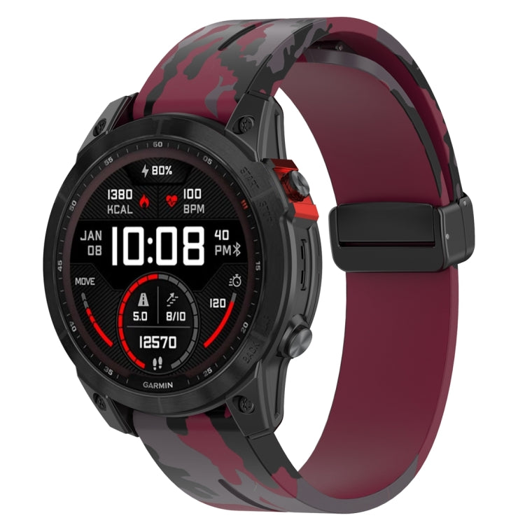 Correa de Reloj de Silicona Garmin Fenix 7X Estampado Camuflaje Rojo Vino con Hebilla Negra Plegable Magnética