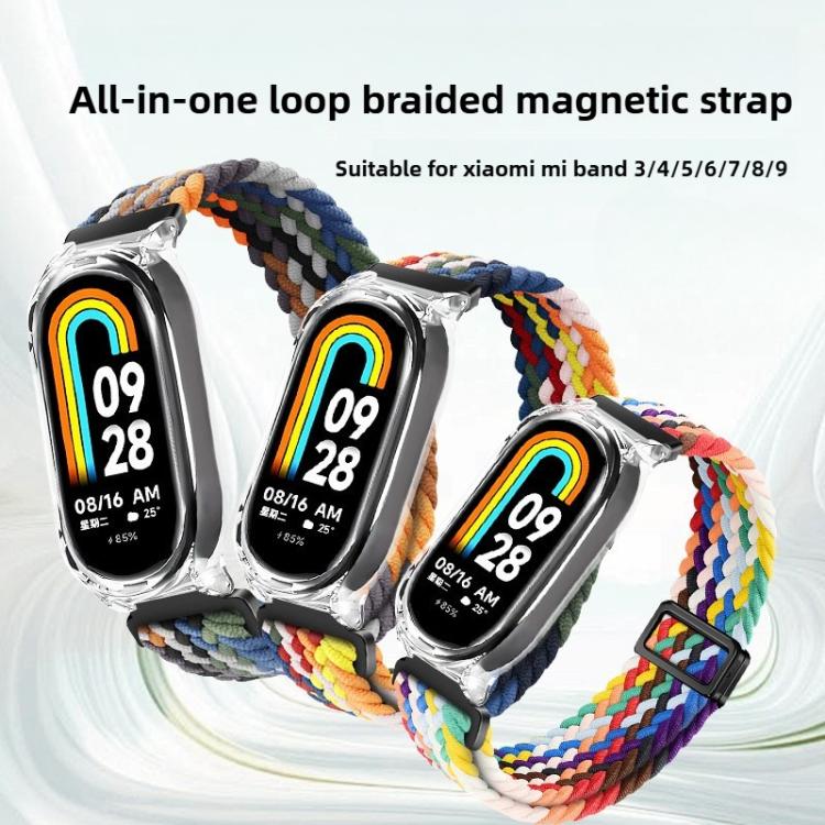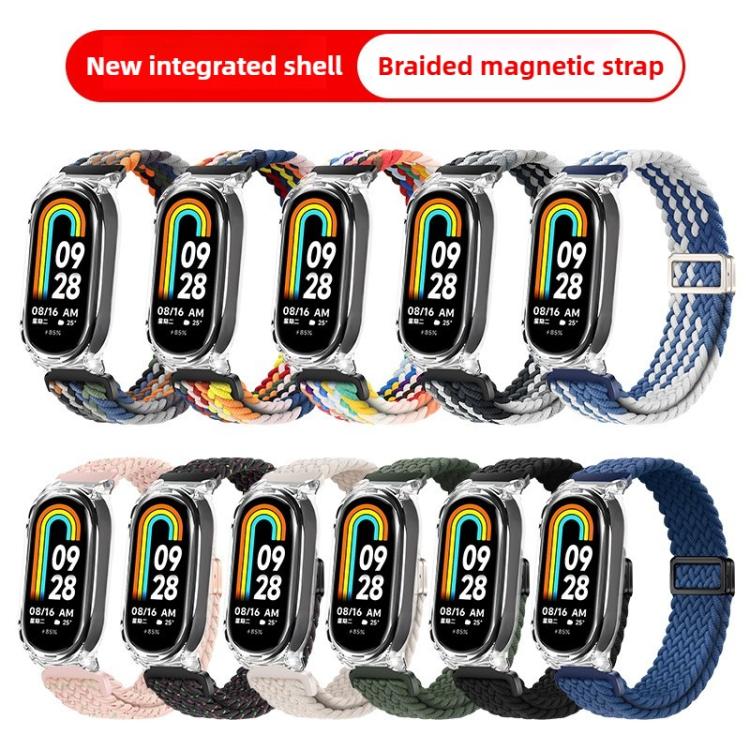 Correa de reloj elástica trenzada de nailon con hebilla magnética y marco de policarbonato transparente para Xiaomi Smart Band 9/8 (verde oliva)