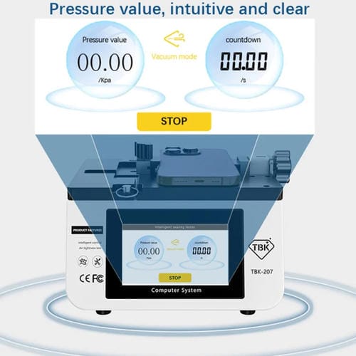 • Potencia de 20W; rango de presión de -40 a 20 Kpa; sistema de control automático PLC; Pantalla HD; modos de operación: vacío, presión positiva y automático; bomba de vacío integrada