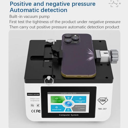 El Detector de Estanqueidad de Aire Inteligente Portátil TBK-207 es un dispositivo avanzado diseñado para la detección precisa de fugas de aire en diversos Productos, especialmente Teléfonos Móviles. Equipado con una bomba de vacío incorporada, permite realizar pruebas bajo presión negativa y positiva para garantizar la hermeticidad del dispositivo evaluado. Su sistema de control automático PLC y Pantalla HD facilitan un manejo sencillo y eficiente, con modos configurables que incluyen vacío, presión positiva y automático. Compatible con múltiples marcas y modelos, este detector Portátil ofrece una plataforma ajustable para detección multidireccional, asegurando una evaluación Completa y fiable. El equipo opera con una potencia de 20W, cuenta con resistencia al agua IP68 y soporta un rango de presión de -40 a 20 Kpa, lo que lo convierte en una herramienta versátil para usuarios que requieren pruebas de estanqueidad precisas y profesionales.