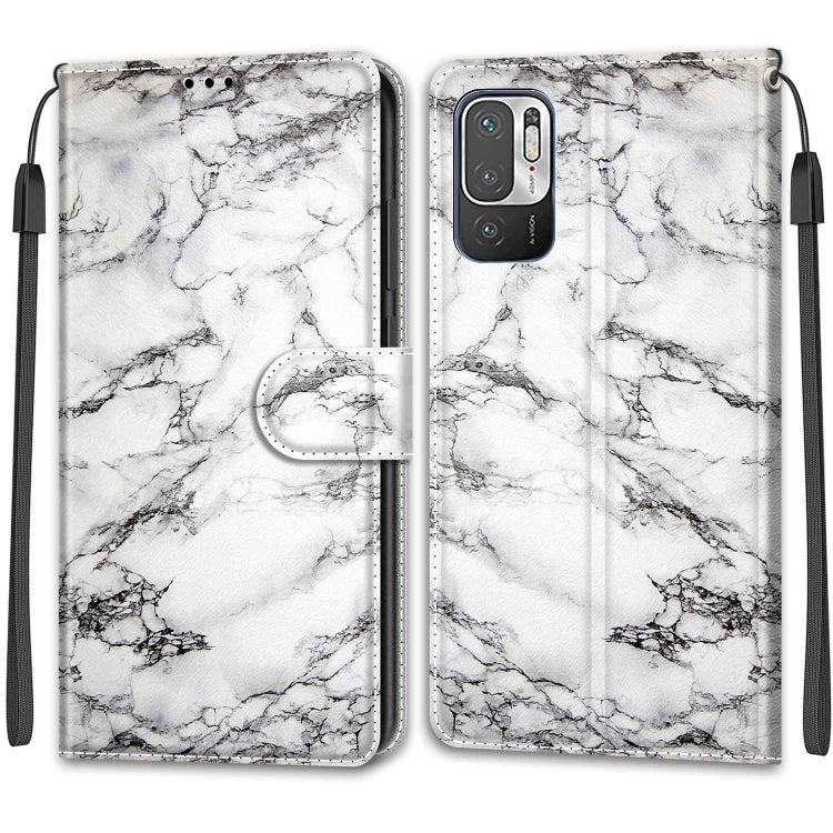 Dibujo de Color de Voltaje Cierre Magnético Cierre Horizontal Flip Pu Funda de Cuero con Soporte y Ranuras para Tarjeta para Xiaomi Redmi Note 10 5G (Mármol Blanco C01)