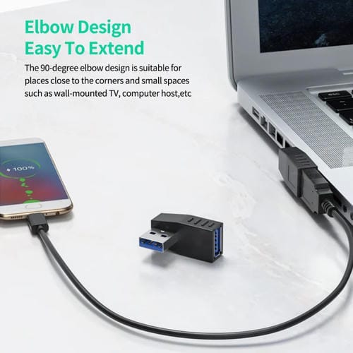 - USB 3.0 con velocidad de transferencia de hasta 5 Gbps; Conector macho a hembra en ángulo de 90 grados, orientaciones Izquierda y Derecha; plug and play sin necesidad de controladores; soporta hasta 10,000 ciclos de Conexión y desConexión