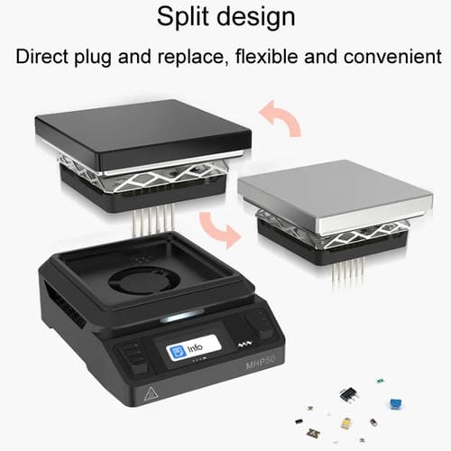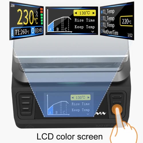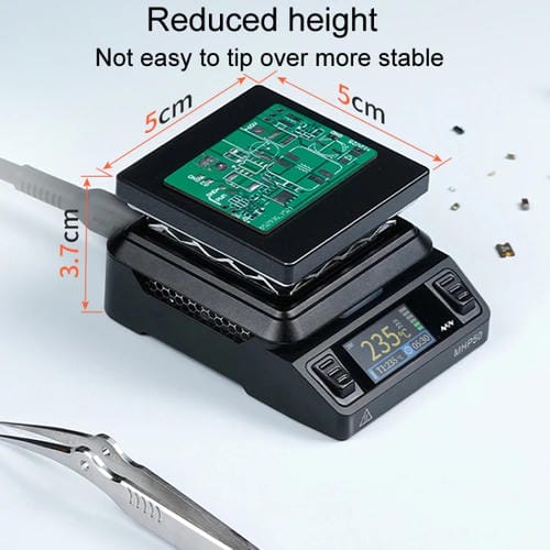 • Potencia de calentamiento: 150 W (DC5525) / 100 W (PD); Pantalla LCD en color con resolución 160 x 80; área de calentamiento de 50 x 50 mm; estabilidad térmica de +/- 3%; tamaño consola 71,5 x 55,5 x 22,5 mm; calentador 50 x 50 x 29 mm; peso consola 78 g, calentador 87 g; interfaz USB tipo C y DC5525; control inteligente de temperatura con función de simulación de horno de reflujo; sistema de seguridad con detección de inclinación que detiene el calentamiento.