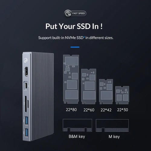 • Puertos USB3.1 Tipo A x3, USB3.1 Tipo C x1, HDMI 4K/60Hz, TF/SD, RJ45 Ethernet Gigabit, Audio/Micrófono 3.5 mm, Soporte NVMe SSD3, tasa de transferencia 10 Gbps, Carga PD 100W, dimensiones 141x73x16.5 mm