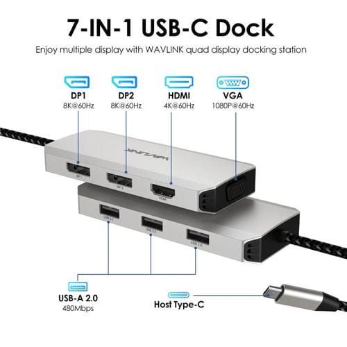 Estación de Acoplamiento Wavlink Wl-Umd307 Tipo C a 2DP 4K HD VGA 3 USB2.0 Hub