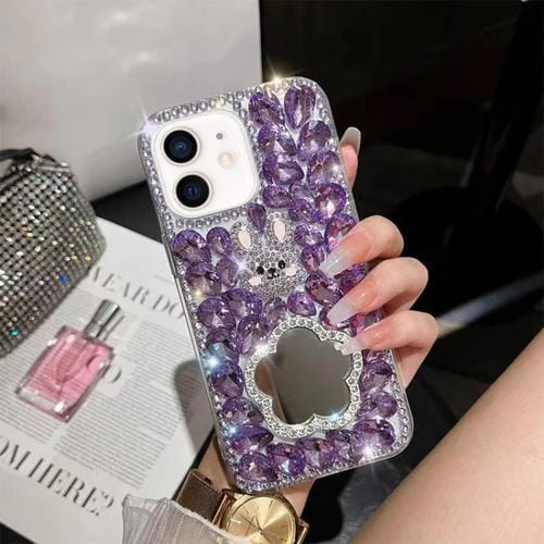 Estuche para Teléfono PC Hecho a Mano Forma Conejito Espejo Diamante iPhone 12 Mini (Flor Morada)