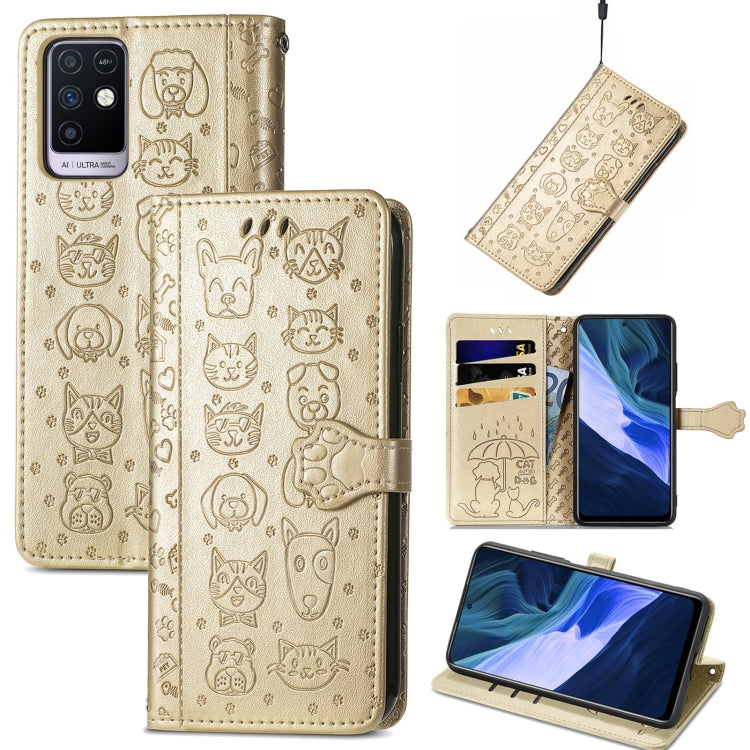 Funda Cuero Horizontal Flip para Infinix Note 10 con Estampado Gato y Perro, Portavillos, Tragamonedas y Cordón (Oro)