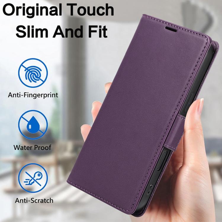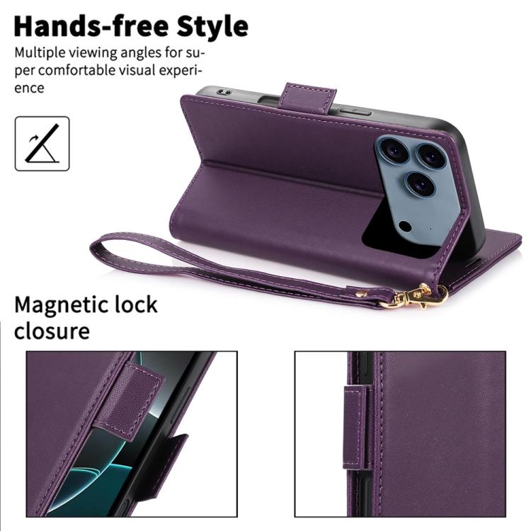 Funda de cuero antirrobo RFID con hebilla lateral para iPhone 17 Pro Max (morado oscuro)