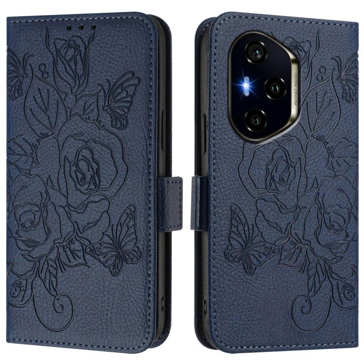 Funda Cuero Antirrobo RFID con Relieve Rosa para Honor 300 Pro 5G y 300 Ultra 5G (Azul Oscuro)