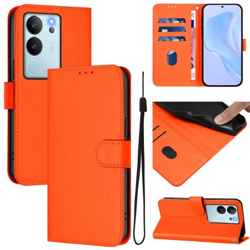 Funda de Cuero con Cordón para Teléfono con Diseño de Piel de Color Liso y Tacto Suave para Vivo V29E 5G Global / Y200 5G Global (Naranja)