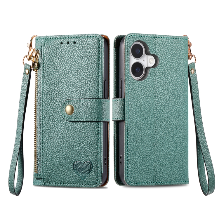 Funda de Cuero con Cordón y Cremallera Love para iPhone 16 Pro Max (Verde)