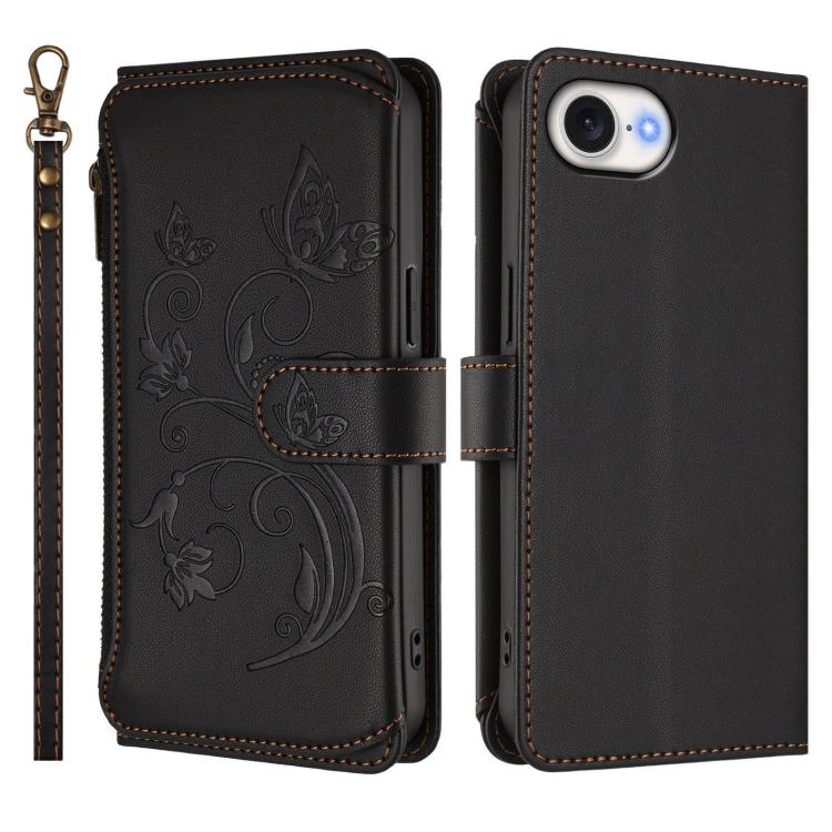 Funda de cuero con cremallera para iPhone 16e, diseño de mariposas, flores y amor, con múltiples tarjetas (negro)