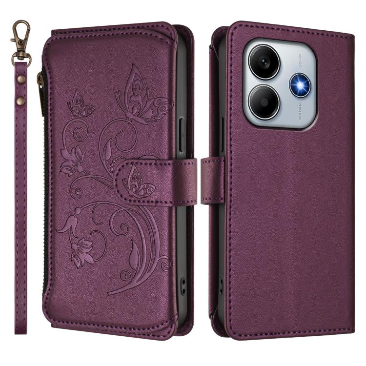 Funda de cuero con cremallera para Redmi Note 14 5G / Xiaomi Poco M7 Pro 5G, diseño de mariposas y flores, con múltiples tarjetas (morado oscuro)