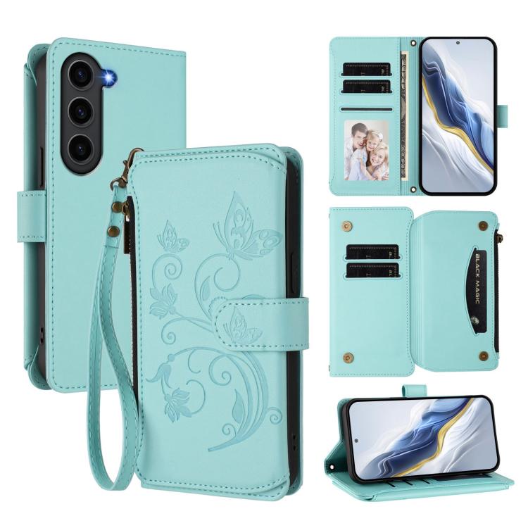 Funda de cuero con cremallera para Samsung Galaxy S23 5G, diseño de mariposas, flores y amor, con múltiples tarjetas (verde menta)