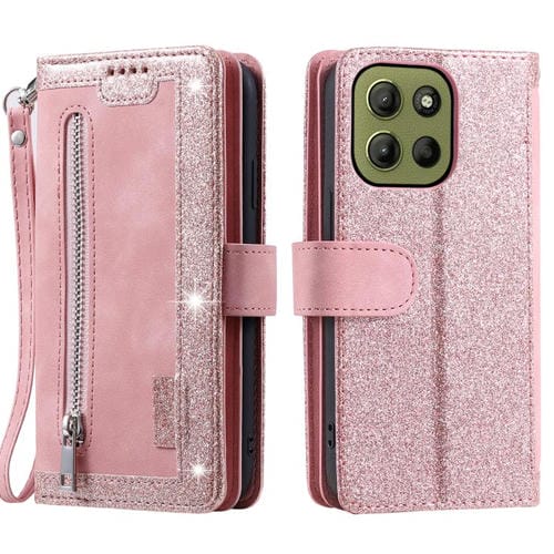 Funda de Cuero con Cremallera y Cordón para Motorola Moto G15 Nine Card (Rosa)
