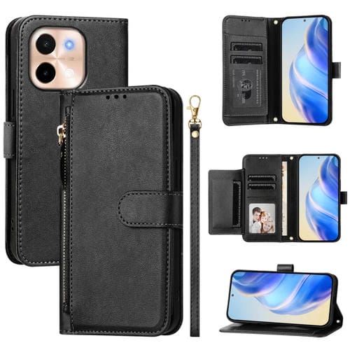 Funda de Cuero con Cremallera y Ranuras para Múltiples Tarjetas para Vivo Y28 4G (Negro)
