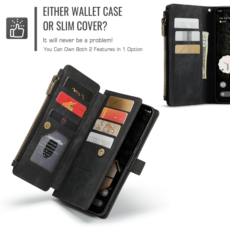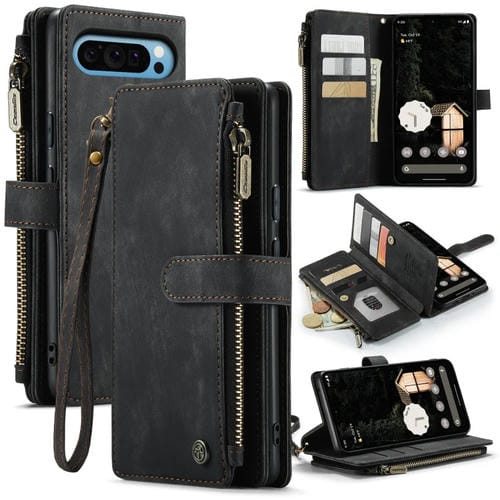 Funda de Cuero Caseme C30 para Google Pixel 9 Pro XL con Cremallera y Ranuras para Tarjetas (Negra)