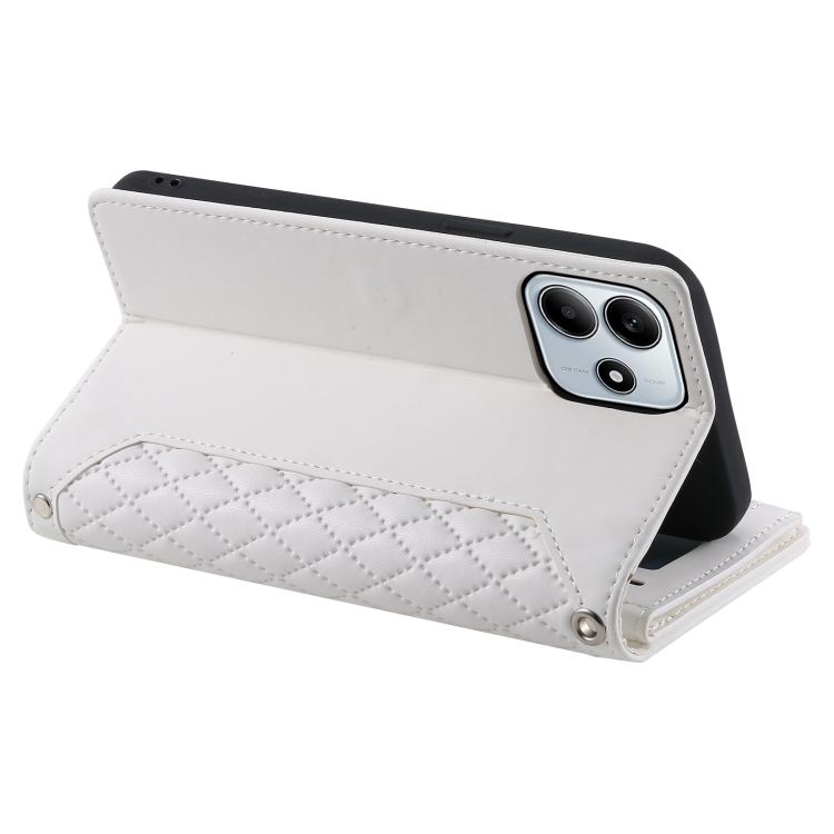 Funda de Cuero con Cremallera y Textura de Cuadrícula para Xiaomi Redmi Note 14 5G con Cordón (Blanco)