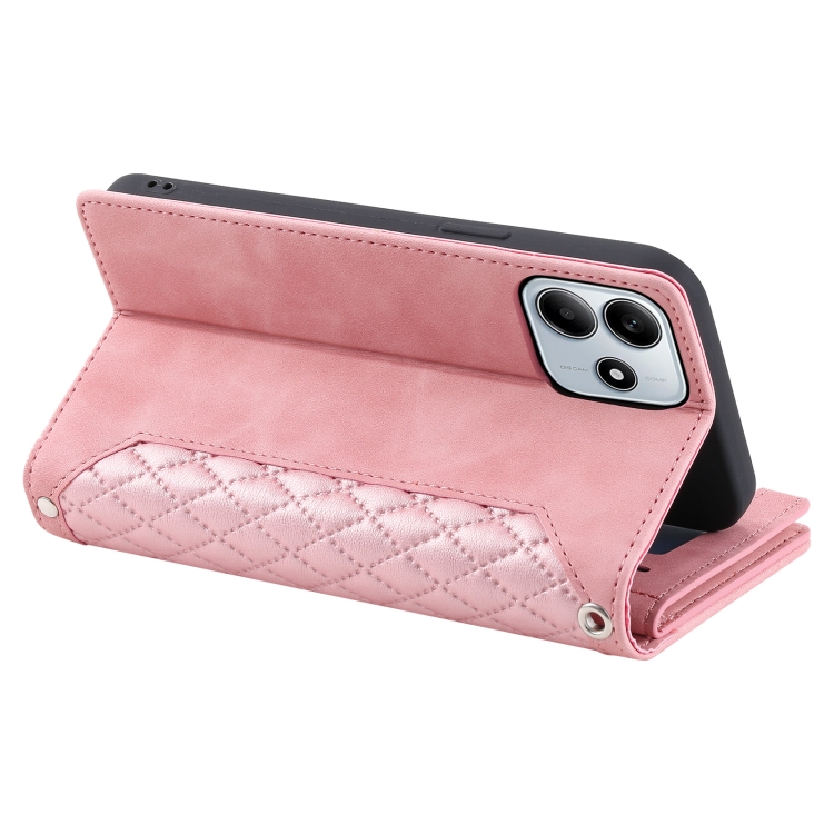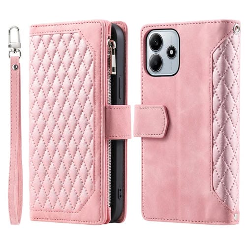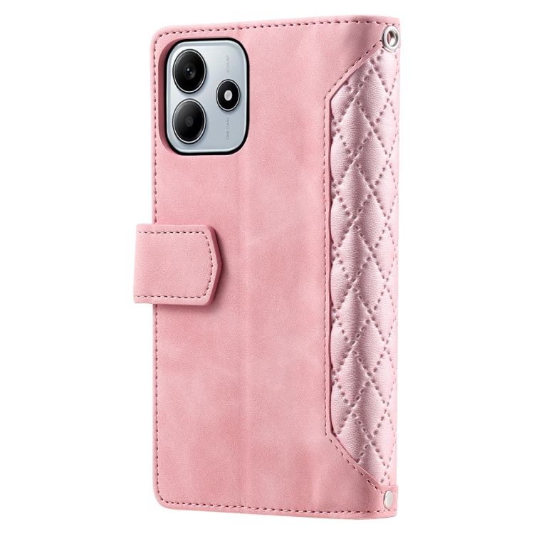 Funda de Cuero con Cremallera y Textura de Cuadrícula para Xiaomi Redmi Note 14 5G con Cordón (Oro Rosa)