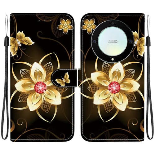 Funda de Cuero Honor X9A con Dibujo, Textura de Cristal y Flor Dorada (Dorada)