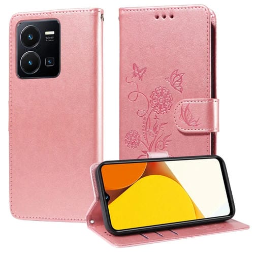 Funda de Cuero con Diseño de Mariposas y Flores En Relieve para Vivo Y35 4G / Y22S / Y22 (Oro Rosa)