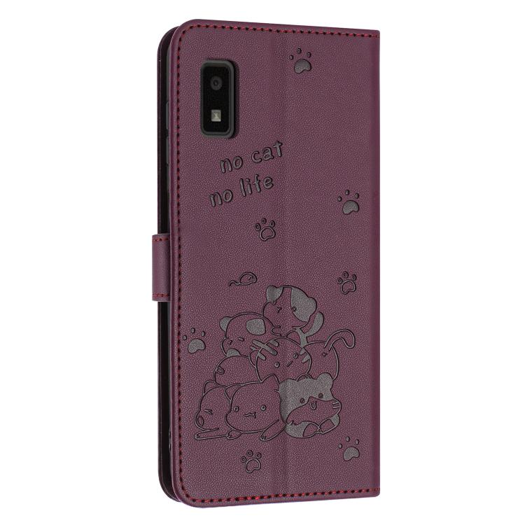 Funda de Cuero para Sharp Aquos Wish 3 con Diseño de Gatito en Relieve y Cordón (Rojo Vino)