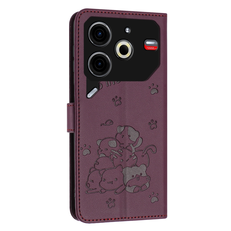 Funda de Cuero para Tecno Pova 6 Neo con Diseño de Gatito En Relieve y Cordón (Rojo Vino)