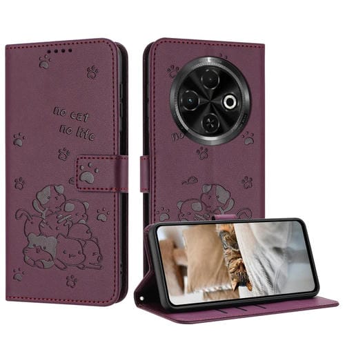 Funda de Cuero para Tecno Spark 30C con Diseño de Gatito En Relieve y Cordón (Rojo Vino)