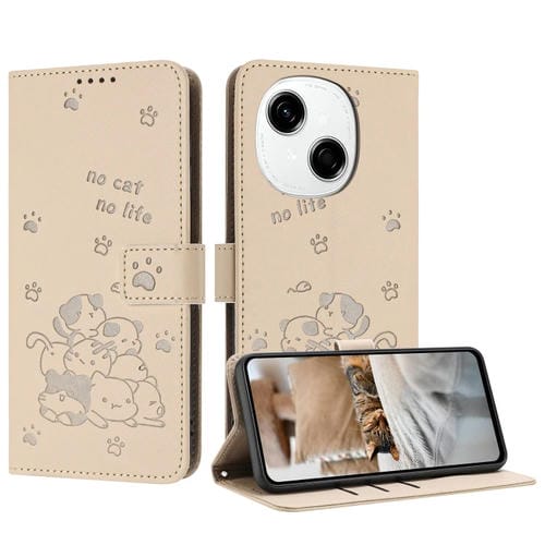 Funda de Cuero para Tecno Spark Go 1/Go 2025 con Diseño de Gatito En Relieve y Cordón (Beige)