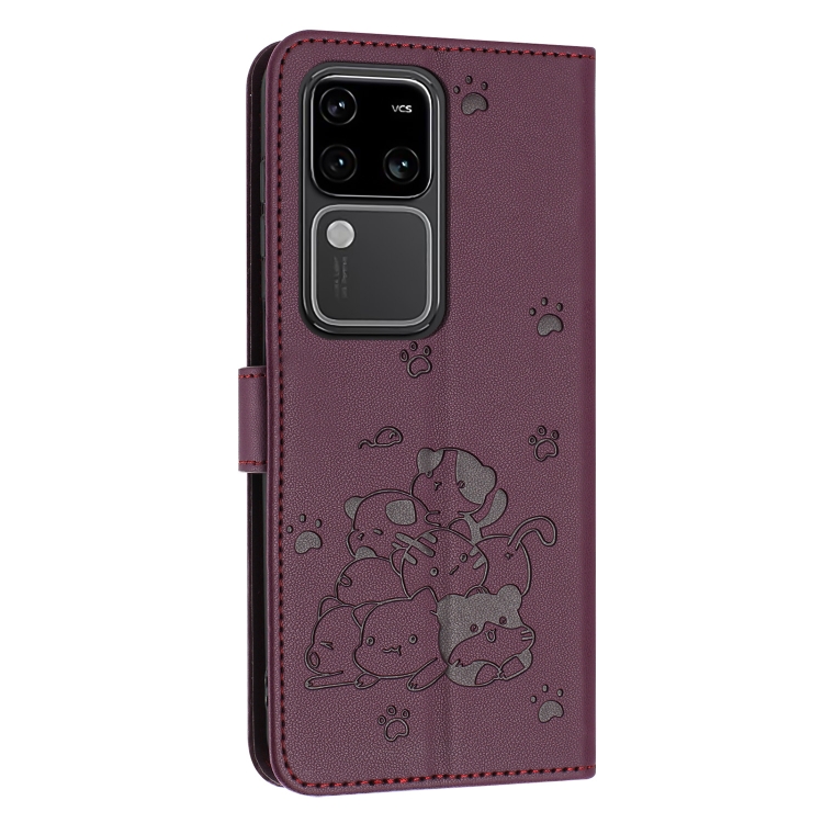 Funda de Piel con Diseño de Gatito En Relieve y Cordón para Vivo S18/S18 Pro (Rojo Vino)