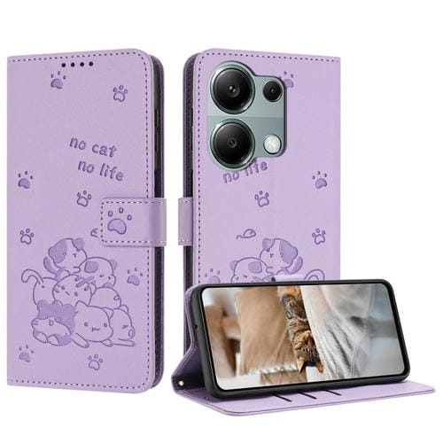 Funda de Piel con Diseño de Gatito En Relieve y Cordón para Xiaomi Poco M6 Pro 4G (Morado)