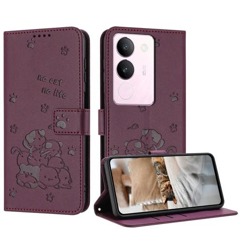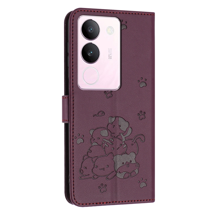 Funda de Piel con Diseño de Gatito En Relieve y Cordón para Vivo S17/S17 Pro/S17T (Rojo Vino)