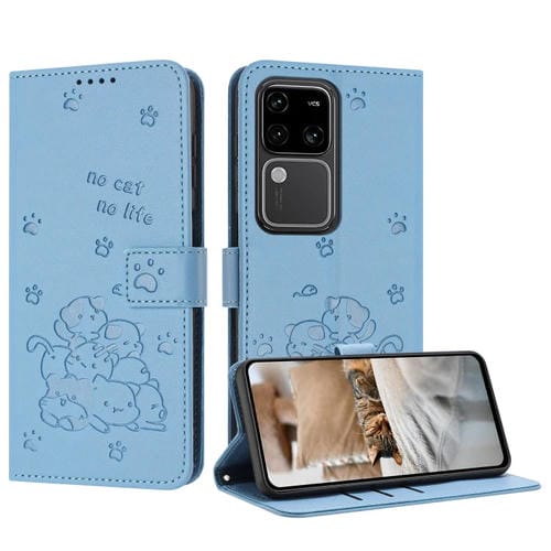 Funda de Piel con Diseño de Gatito En Relieve y Cordón para Vivo S18/S18 Pro (Azul)