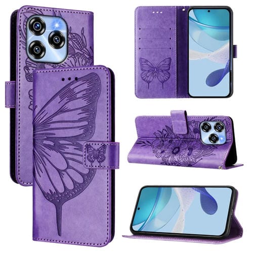 Funda de Cuero para Oukitel C50 con Diseño de Mariposa en Relieve (Morado)