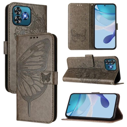 Funda de Cuero para Oukitel C53 con Diseño de Mariposa en Relieve (Gris)