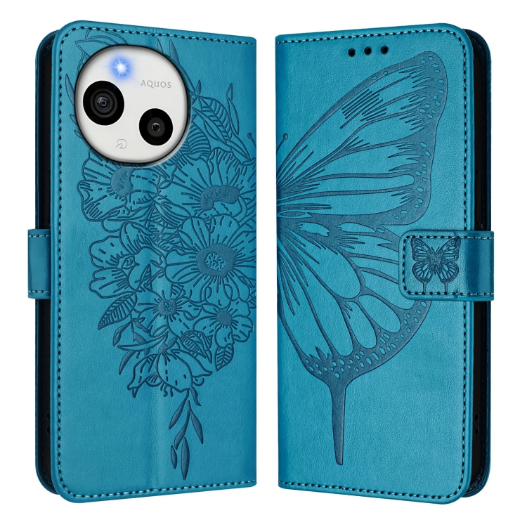 Funda de Cuero para Sharp Aquos Sense9 Plus con Diseño de Mariposa en Relieve (Azul)