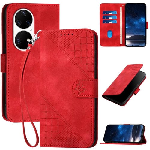 Funda de Cuero Huawei P50 Pro con Diseño Mariposa en Relieve y Cordón (Rojo)