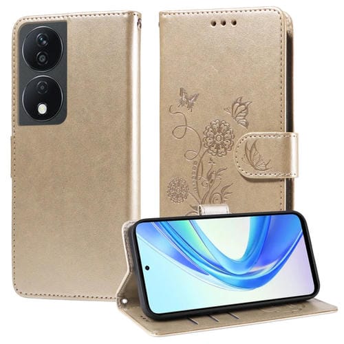 Funda de Cuero Honor X7B 5G/4G/90 Smart 5G con Diseño de Mariposas y Flores en Relieve (Dorada)