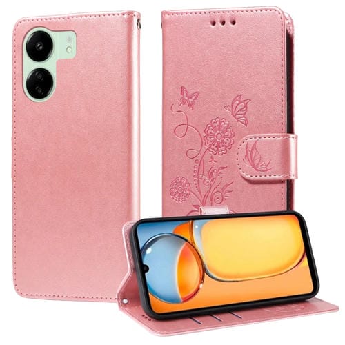 Funda de Cuero con Diseño de Mariposas y Flores En Relieve para Redmi 13C 5G/4G/13R (Oro Rosa)
