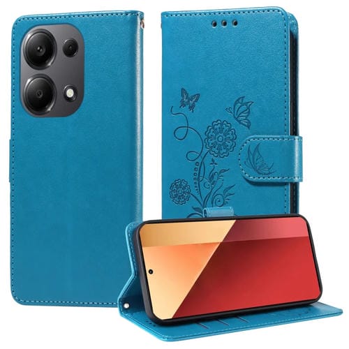 Funda de Cuero con Diseño de Mariposas y Flores En Relieve para Xiaomi Poco M6 Pro 4G (Azul)