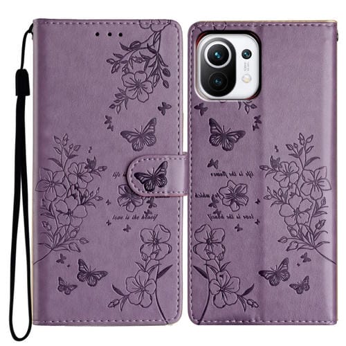 Funda de Cuero con Diseño de Mariposas y Flores para Xiaomi Mi 11 Lite (Morado)