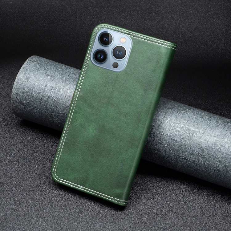 Funda de Cuero iPhone 13 Pro Doble Hilo de Coser (Verde)