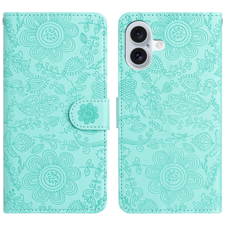 Funda de Cuero iPhone 16 Estampado Floral En Relieve (Verde Claro)