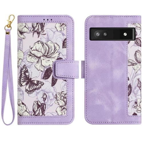 Funda de Cuero con Estampado Floral para Google Pixel 7A con Cordón (Morado Claro)