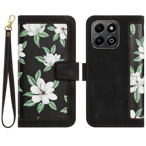 Funda de Cuero con Estampado Floral y Cordón para Honor X6B (Negro)