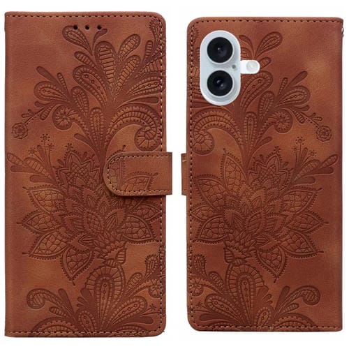 Funda de Cuero para iPhone 16 Plus con Hebilla Magnética y Diseño Floral en Relieve (Marrón)