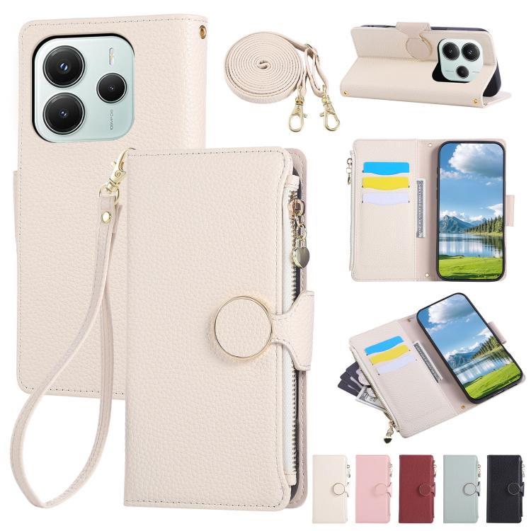 Funda de cuero con hebilla redonda y cremallera para Redmi Note 14 5G, con correa cruzada (blanca)